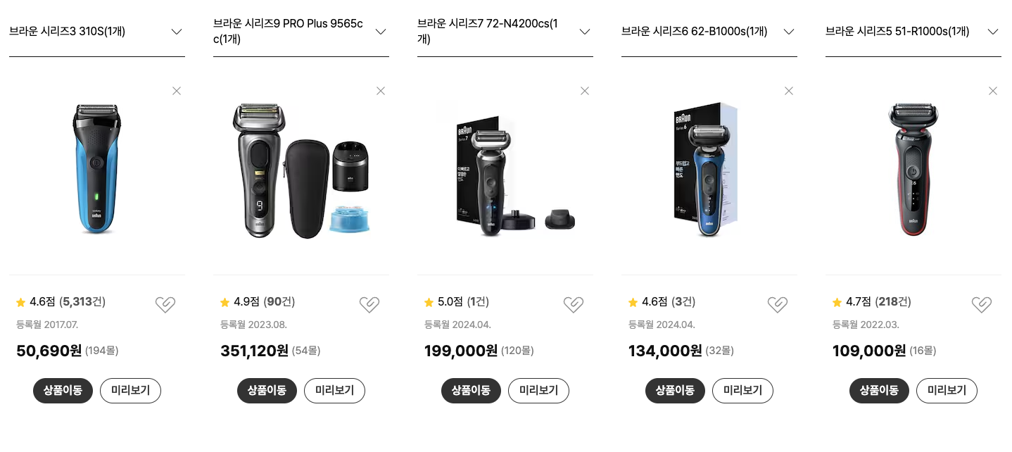 다나와에서 모델별로 하나씩 최저가를 검색해서 비교했습니다. 이번에 구입한 시리즈3 310S은 5만원선이고 그 위로는 다들 10만부터 시작합니다. 시리즈9 프로 라인의 경우는 30만원이 넘어가지만 그만큼 기능이나 옵션이 다양합니다.