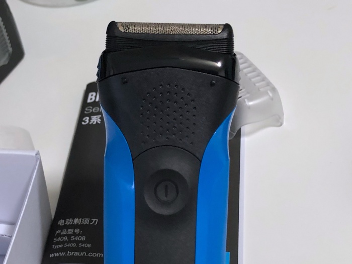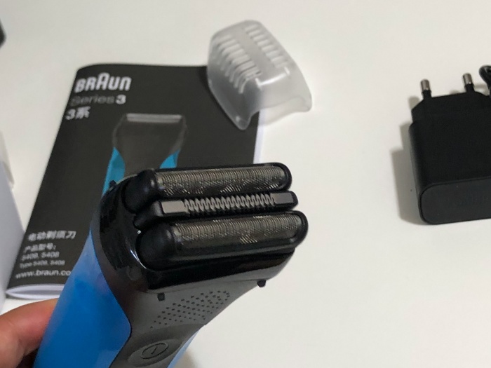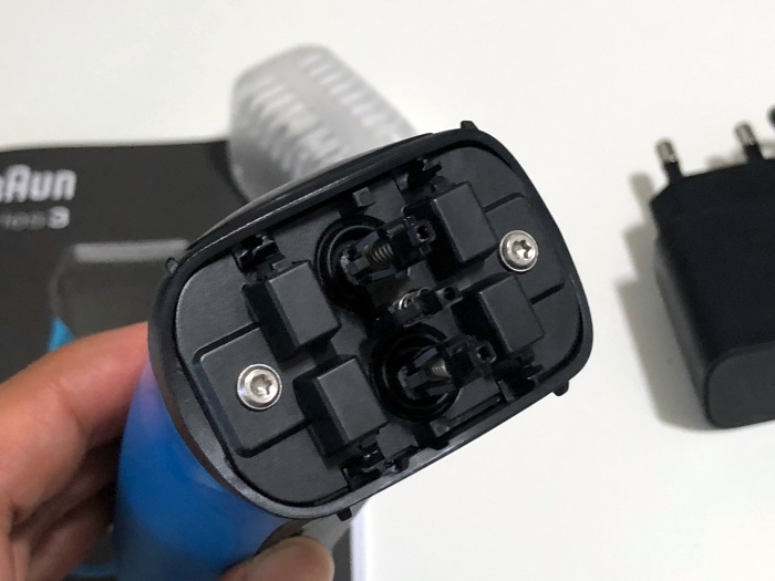 커버를 열면 3개의 커팅요소가 있는 면도기 헤드가 보입니다. 가장자리 2개의 면도망은 좌우로 움직여서 피부에 더 가깝게 밀착합니다. 고급 기종의 경우는 360도 돌아가는 방식이라 이렇게 고정된 상태에서 좌우로 움직이는 날보다 더 디테일한 면도가 가능하겠죠.