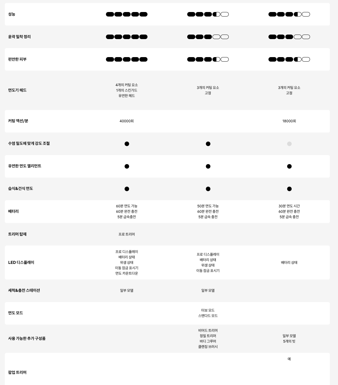브라운 시리즈9 / 8 / 3 제품을 비교한 표입니다. 브라운 공식 홈페이지에서 3개의 모델을 비교해서 성능을 볼 수 있습니다. 시리즈9 제품이 성능으로 당연하게 5점만점이고 8과 3은 3점반으로 성능으로 같습니다. 다만 윤곽 밀착 정리나 편안한 피부 그리고 부가적인 편의기능과 옵션에서 차이가 납니다.