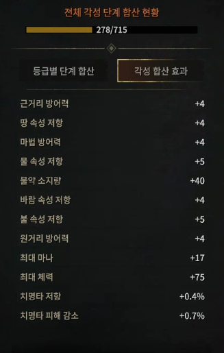 코스튬도 같이 각성을 시켰는데 합산 효과를 보니깐 뭔가 차이가 많이납니다. 가디언은 토탈 275단계 각성했지만 코스튬은 55단계 각성이라 각성 단계가 월등하게 많이 차이나지만 100단계만 각성해도 합상 효과는 코스튬이 더 좋을 것 같네요.