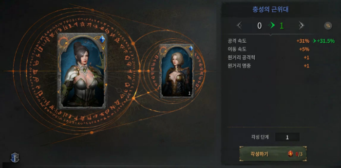 일반 25단계 / 고급 20단계 / 희귀는 15단계 / 영웅 10단계 / 전설 5단계 / 신화 5단계까지 각성이 가능합니다. 과금러 아닌 이상에는 희귀부터 각성하는게 쉽지 않겠네요.