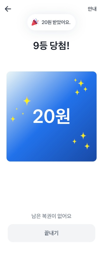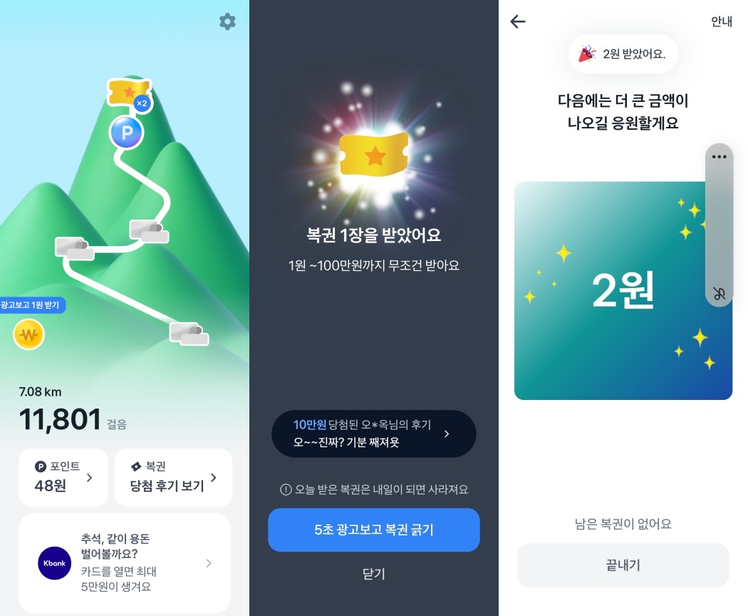 복권을 터치하면 바로 긁어서 확인하는 방식이 아니라 광고를 일정시간 시청하고 복권의 금액을 확인할 수 있습니다. 사용자들이 가장 불편하게 생각하는 부분인데 저는 그냥 걸으면서 터치 해놓고 20~30초 뒤에 확인해서 끄는 방법을 이용하고 있습니다.. 역시나 귀찮은건 마찬가지구요.