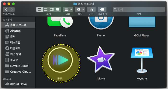 맥북 파인더에서 응용프로그램으로 들어가보니 IINA 앱이 정상적으로 설치된 모습을 확인할 수 있었습니다.