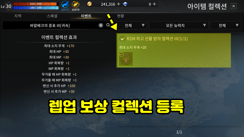 또한 레벨업 보상으로 "이벤트"에서 받은 컬렉션들은 잊지 마시고 "컬렉션->이벤트"에서 등록하고 효과를 적용해야합니다. 컬렉션들이 모이고 모여서 캐릭터가 강해지거든요.
