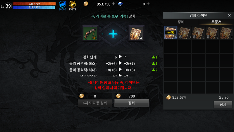 목재 재료가 조금 모여서 "제작-활-레이븐 롱 보우"를 제작해서 강화를 시도합니다. 기존 +6 강철활 사용중이라서 +7이나 +8무기로 교체하고 싶은 욕망이 꿈틀거려서요....