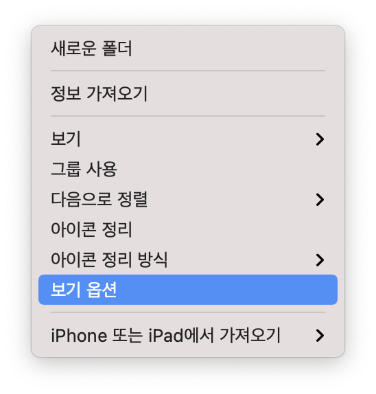 4. 만약 이 폴더의 설정을 항상 자동정렬되는 상태로 유지하고 싶다면 다시 두 손가락으로 터치패드를 선택하거나 마우스 우클릭으로 옵션 팝업을 불러와 "아이콘 정리방식" 또는 "보기 옵션"을 선택합니다. 보기 옵션에는 모든 옵션들이 다 있고 아이콘 정리 방식도 보기 옵션에 포함된거라 둘이 똑같아요.