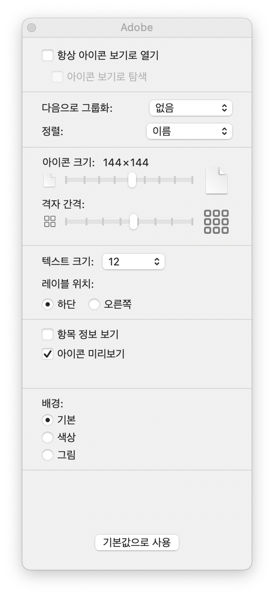 대신 정렬에서 "이름"이나 "최근 사용일" 등으로 정렬하면 해당 폴더에 빈곳이 없이 자동으로 지정한 정렬 순서로 아이콘들이 정리됩니다. 폴더를 더 넓게 변경해도 아이콘들은 그 넓어진 크기에 반응해서 움직이는거죠. 반응형이라고 해야할라나... 그리고 원하는 설정을 했으면 (아이콘의 크기까지 그리고 아이콘들의 격자 간격까지 설정이 가능합니다.) 맨 하단의 기본값으로 설정하면 "이 해당 폴더"는 이 설정을 기본값으로 가지고갑니다.